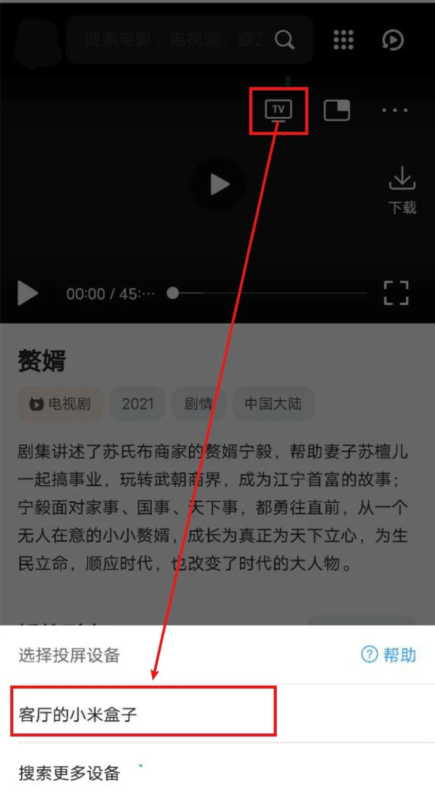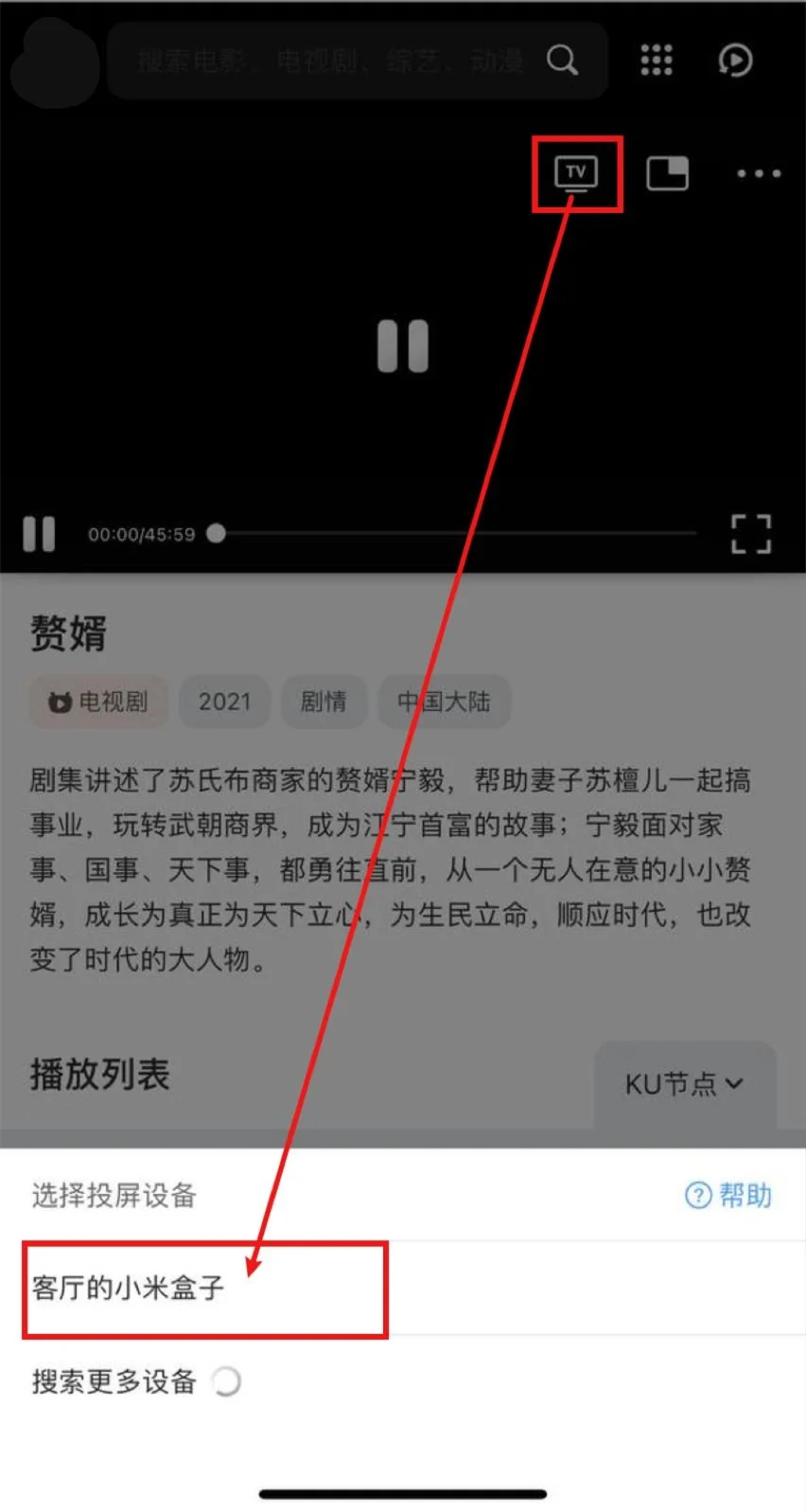 打开QQ浏览器(会接管网页播放器)->打开51kan影视->播放视频->选中投屏图标->等待搜寻出智能电视/电视盒子->选中,即可投屏。